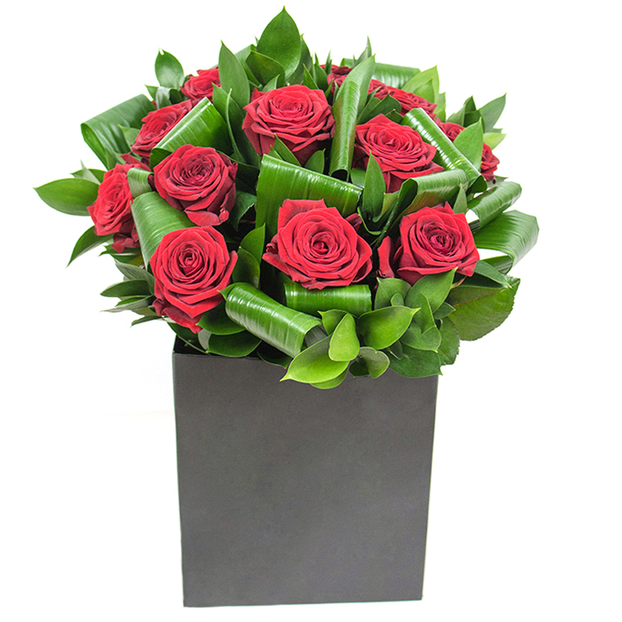 Indulge in the beauty of our hand-crafted bouquet, designed to infuse any room with elegance and life. Featuring a captivating mix of bold red roses, delicate aspidistra leaves, and the soft allure of ruscus, this arrangement is carefully assembled to present a vibrant harmony of color and texture.