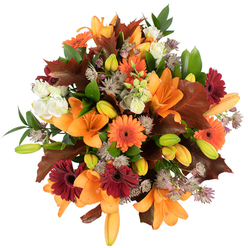 Add a touch of elegance to any occasion with our meticulously arranged bouquet. Featuring a lively mix of yellows, oranges, greens, and a splash of blue, each flower is hand-selected for maximum freshness and quality. The design is thoughtfully crafted to ensure a unique and stunning display.